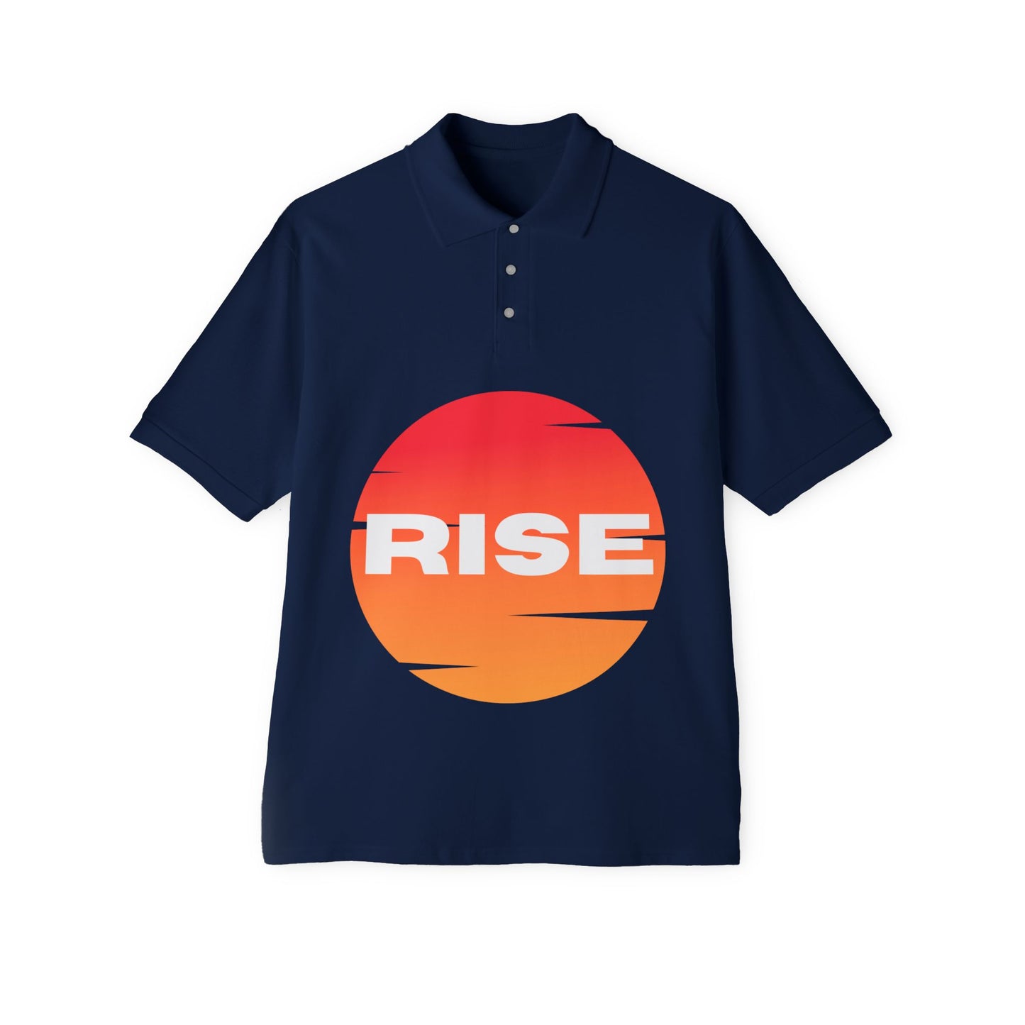 Elevate your everyday style with this Men's Piqué Polo featuring a RISE graphic design for motivation. Perfect for casual wear or dressing up an outfit, this polo brings a touch of sophistication to your wardrobe. Ideal for men looking for comfortable yet stylish clothing.