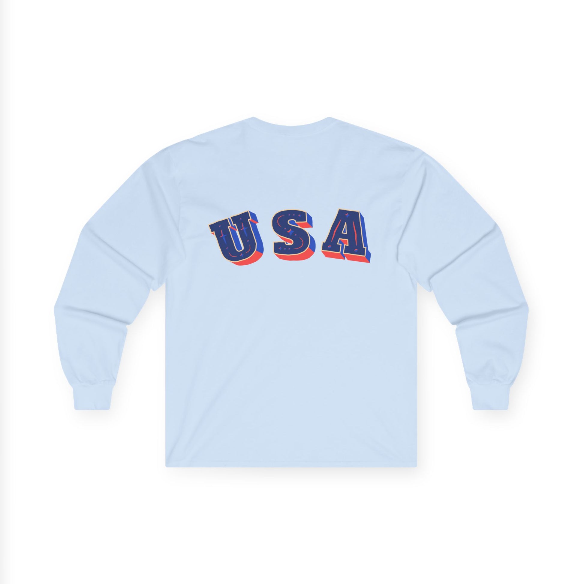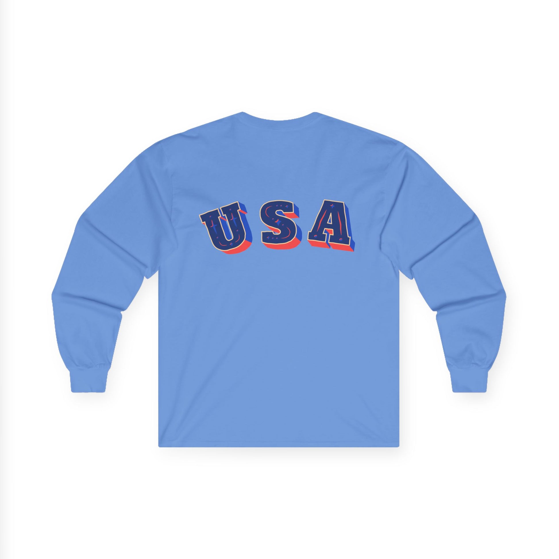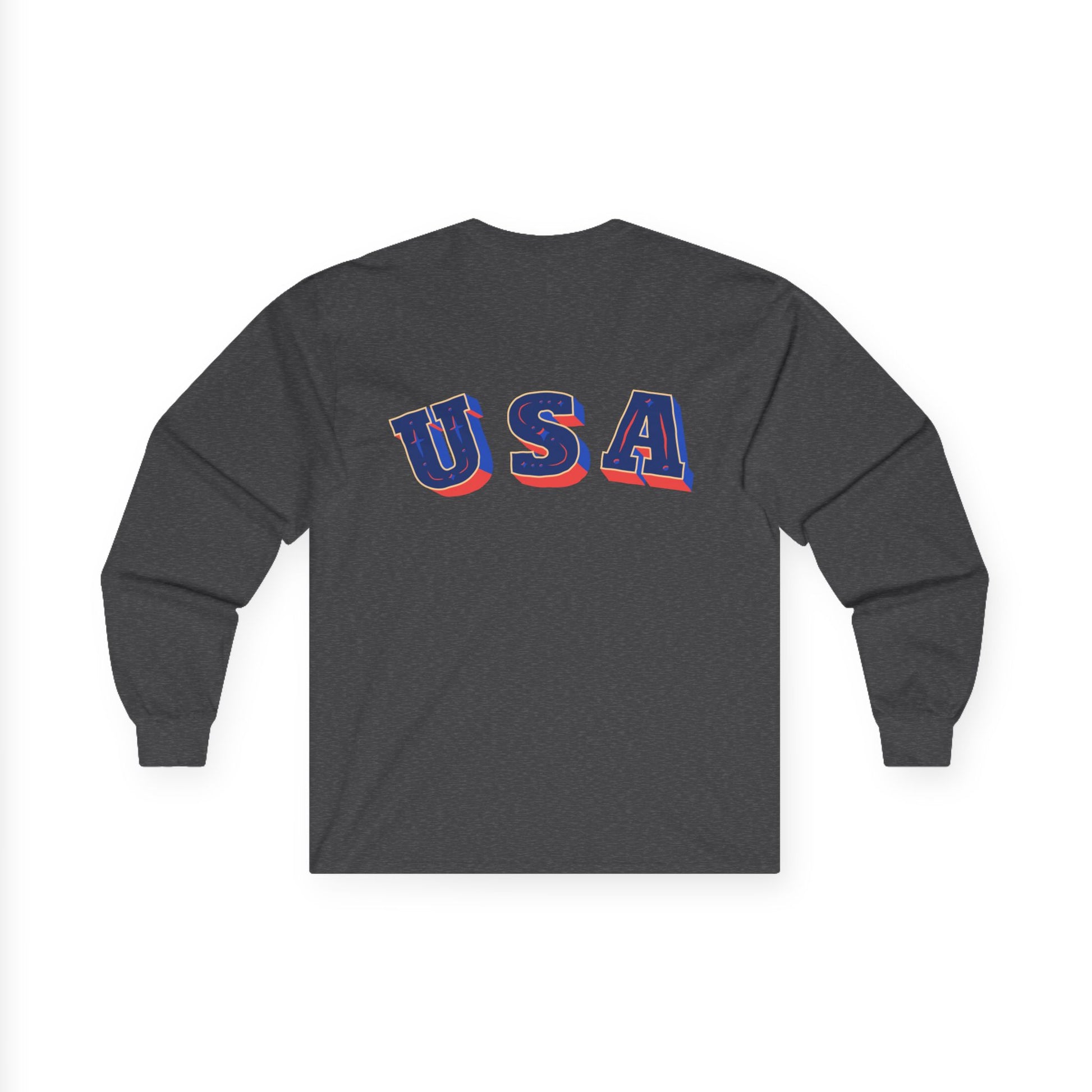 Introducing a stylish Unisex Ultra Cotton Long Sleeve Tee that radiates patriotism. Crafted from eco-friendly cotton, this tee boasts a thicker vintage feel that’s perfect for any casual occasion. Its unique design features vivid American flag graphics on the front and a bold ‘USA’ print on the back, making it a fantastic choice for celebrating Independence Day, Memorial Day, or anytime you want to show your national pride.